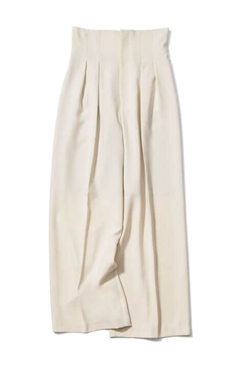 タック入りで腰まわりの肉感を拾わず、センタープレスで脚長見せもおまかせ♪ 膨張色でもあるホワイトは、ハイウエスト&ベルトで締められるデザインでスタイルアップを意識して。