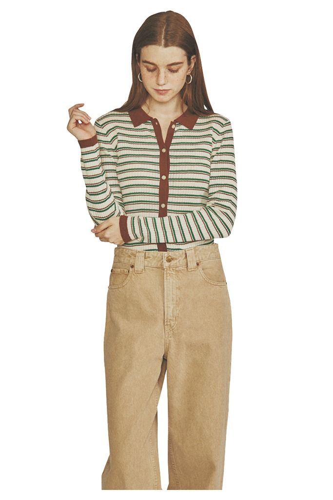 えりからのびたブラウンの縦ラインで、ボーダーにありがちな間のびを回避。グリーンを効かせつつもアイボリーが多めのマイルドな配色で、色を気軽にとり入れられる。ボタンの開け閉めでネックラインを自由に調整。自宅で洗えて手入れもラク。