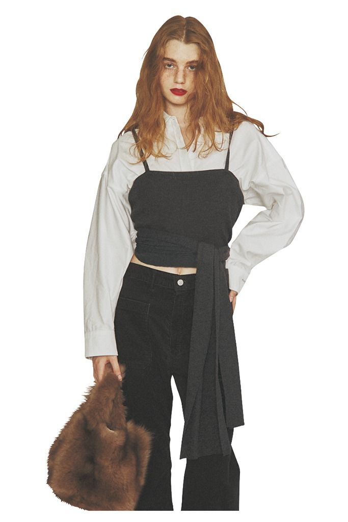 ほどくとひざ下までのびる帯を後ろで結んだりカシュクール風にしたり、アレンジを楽しめるマルチウェイ。リボンのようにたらした帯がスタイリングに動きをつけ、いつもの白シャツを違った表情に。えりが見えることでハンサムさはキープ。