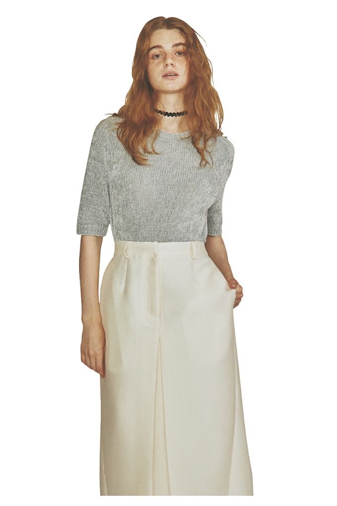 モールヤーンのなめらかな光沢と肌に吸いつくようなさわり心地。リラックスムードへ導きつつ、冷静なブルーでシックに。適度な重みがあり、すとんと下に落ちるため、ニットながらフラットなシルエットにまとまってタックインも簡単。モール特有のムラのあるツヤが、白スカートの緊張感までほどいてくれる。