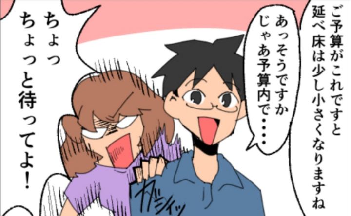 後日、マイホームの相談をする業者の元を訪れたハルミさん夫婦。提案されたのは閑静な住宅地! 「結構高いなぁ」と怯む夫に対し、自分の理想を押し付けるハルミさん。予算を気にする夫に「日当たりは大事でしょ!」「延床面積なんて後から変えられないんだよ