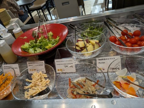 中央のサラダコーナーには、色とりどりの野菜の他、九州でメジャーな海藻の「おきゅうと」を使用したお惣菜(写真下段中央)を楽しむことができます。