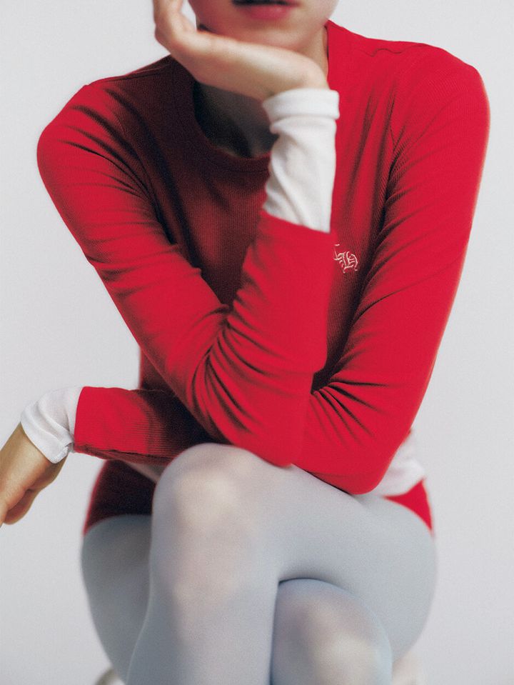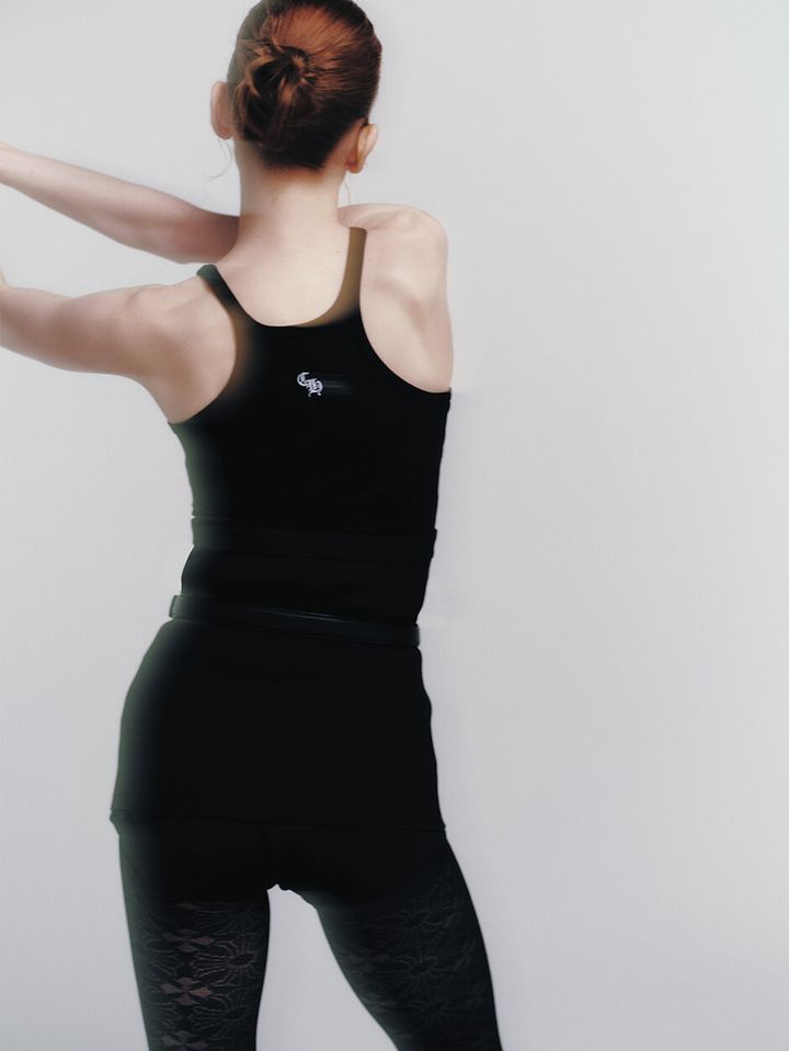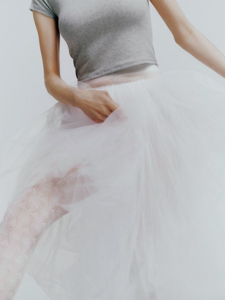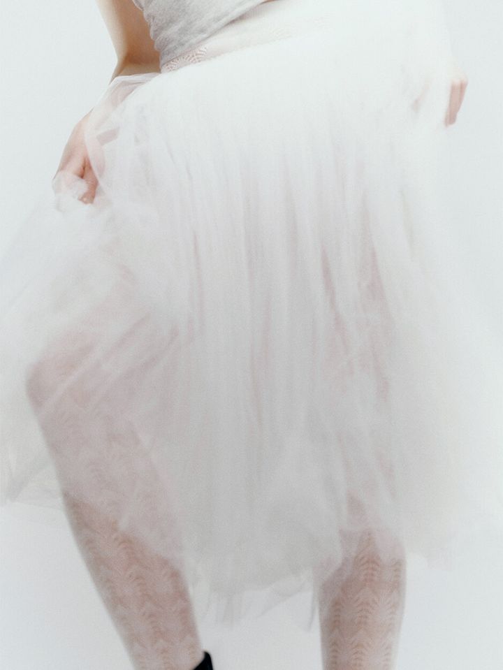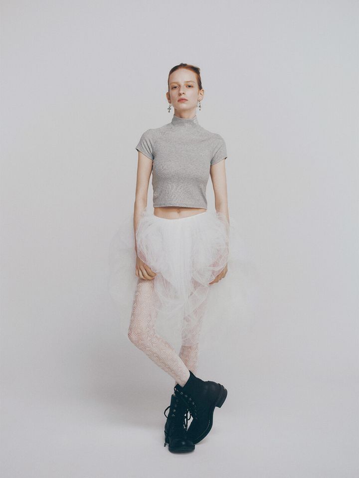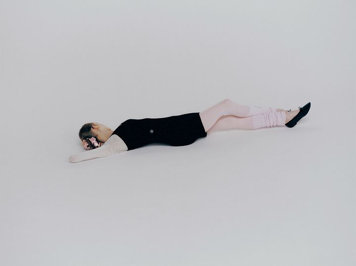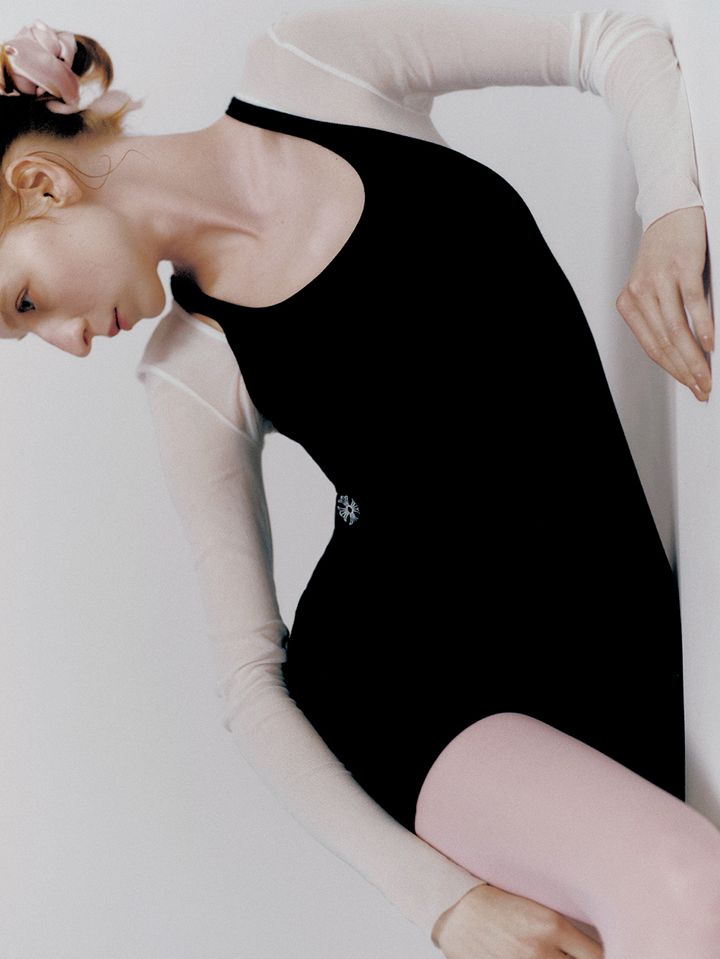 dress ¥106,700 by CHROME HEARTS CHROME HEARTS TOKYO,tights ¥1,650 by CECILIA DE RAFAEL POCO A POCO,leg warmers reference item and shoes ¥60,500 by REPETTO LOOK.INC BOUTIQUE DIVISION, top and ribbon stylist’s own