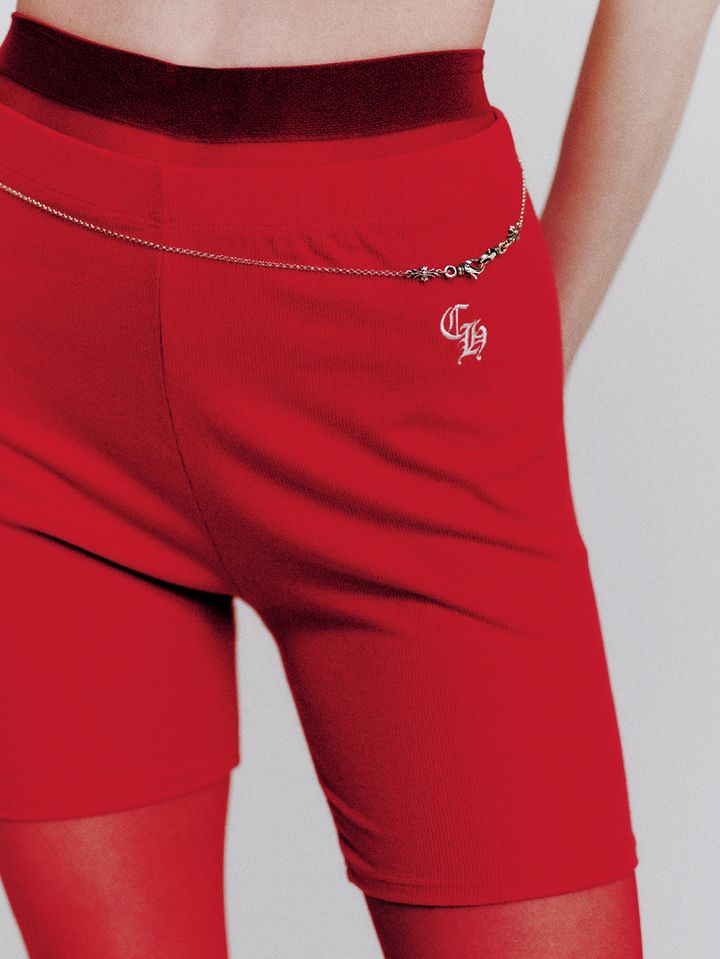 shorts ¥77,000 and necklace (attacherd to the waist) ¥137,500 by CHROME HEARTS CHROMEHEARTS TOKYO,tights stylist’s own