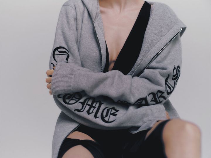 hoodie ¥708,400 and earring (each) ¥85,800 by CHROME HEARTS CHROME HEARTS TOKYO,shoes ¥60,500 by REPETTO LOOK.INC BOUTIQUE DIVISION, bodysuit and tights stylist’s own