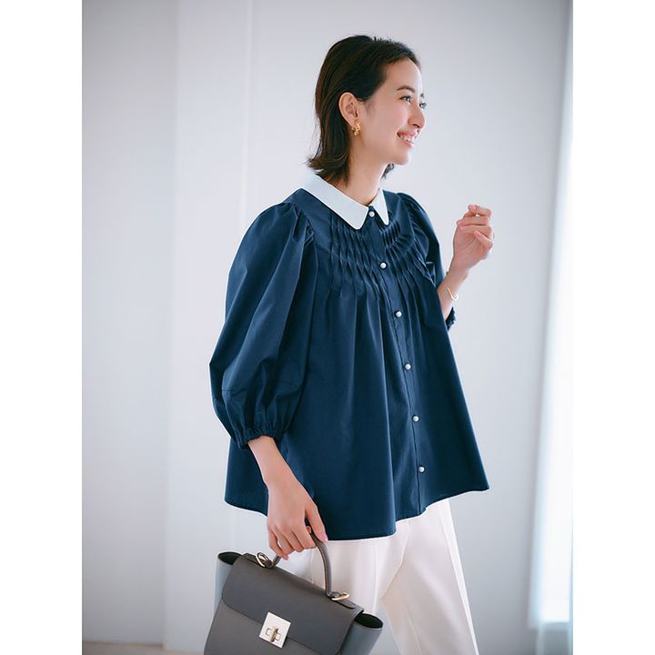 胸元のラジアルウェーブタックがポイントの七分袖ブラウス。取り外せる小衿やパールボタン、ふんわり袖など、1枚で華やぐ要素が満載。