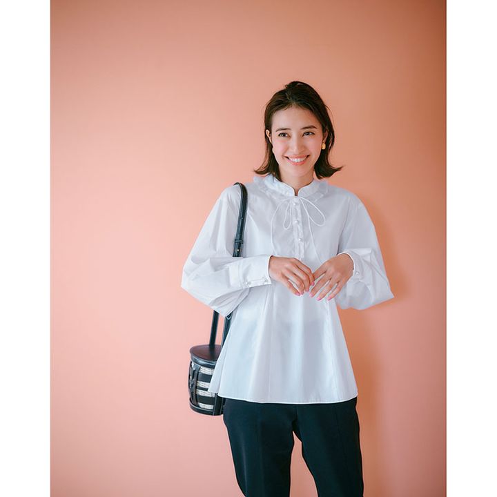 ブラウス¥22,000(ソーノ/ミラク)パンツ¥19,800(デミルクスビームス/デミルクスビームス新宿)イヤリング¥16,200(アビステ)バングル¥220,000(シェルビー/シェルビー表参道)バッグ¥13,200(ダイアナ/ダイアナ銀座本店)