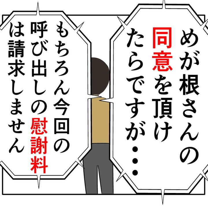 めいさんは「めが根さんの同意を頂けたらですが・・。もちろん今回の呼び出しの慰謝料は請求しません」と答えます。