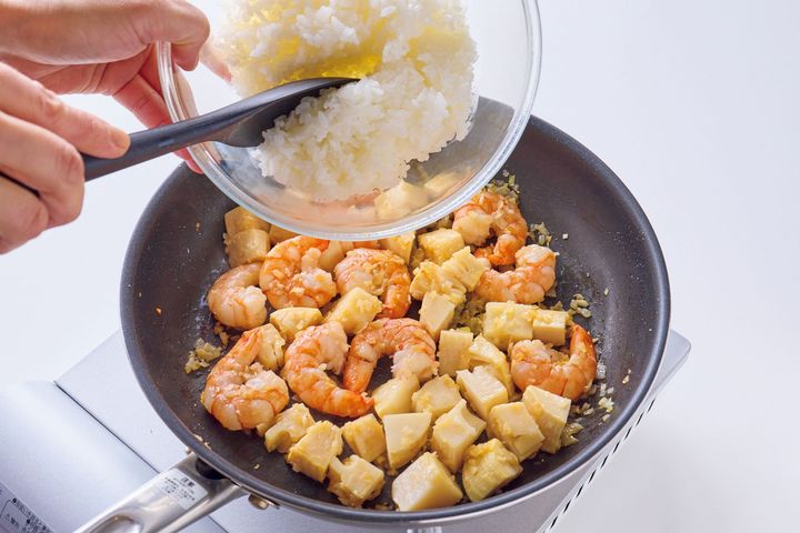 (2)フライパンにバター20gとにんにくを入れて中火で熱し、香りが立ったら玉ねぎを加えて炒める。しんなりしたらえび、たけのこを加えてさらに炒める。えびの色が変わったら、ご飯を加えて炒め合わせ、塩小さじ1/4、こしょう少々、しょうゆ小さじ1/2、パセリを加えて混ぜる。