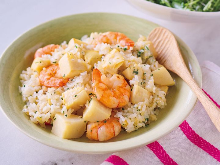 今回は、ころころに切ったたけのこと、ぷりぷりのえびの食感が楽しい炒めピラフをご紹介します。