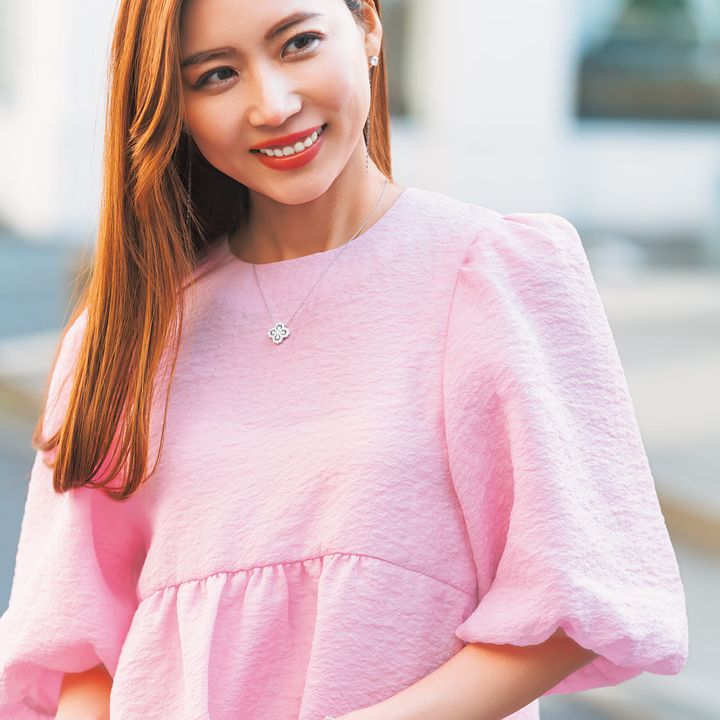 ピンクを着るだけで幸せオーラ全開。「ホワイトのパンツを合わせたら夫からも大好評。息子もママ可愛いねと褒めてくれて家族でハッピー気分に♡」(花岡さん)
