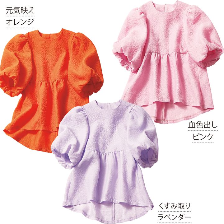チークみたいに顔映えするこだわりの発色。気になるウエストや二の腕もふんわりシルエットでカバーして、ほっそり効果も叶う全方位美人トップスです!