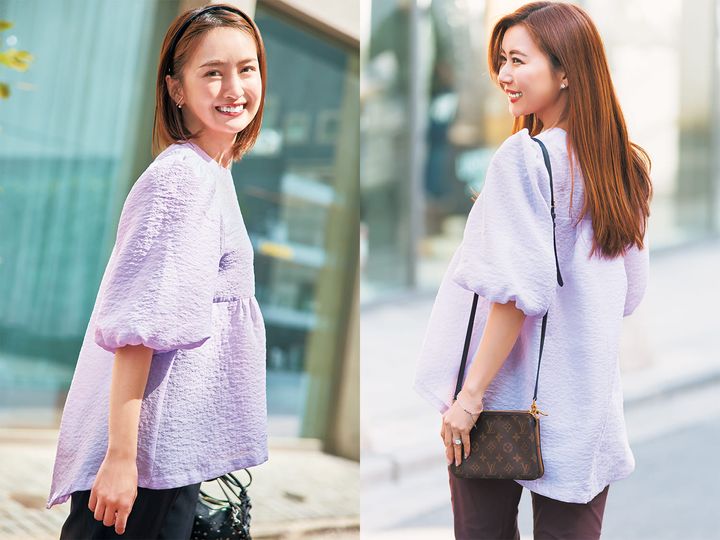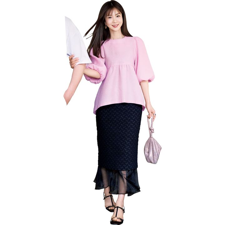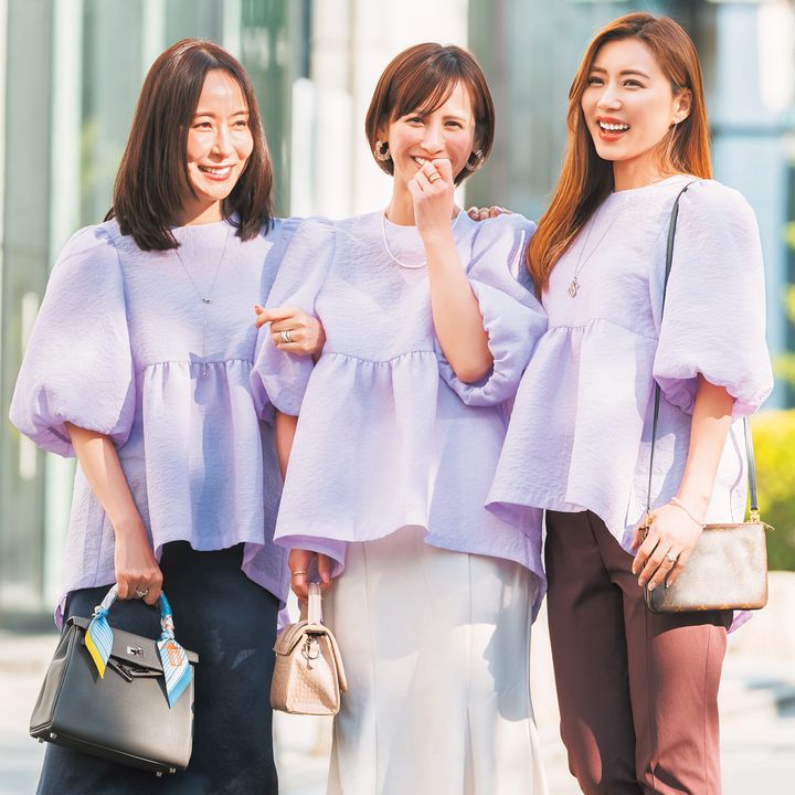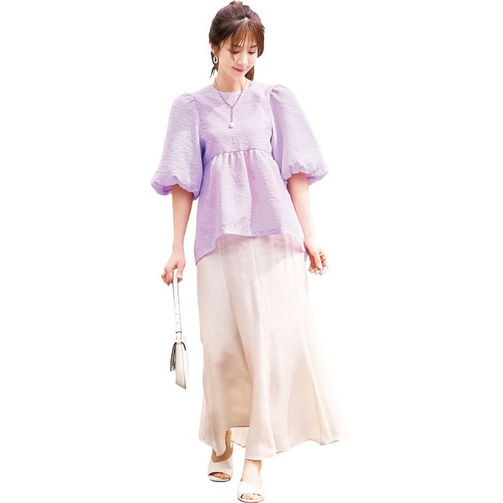 上品なラベンダーカラーが美ST世代の悩みの肌くすみも即解消。)「ラベンダーはお出かけにぴったりな華やかな印象で、クラスアップできます」(笹倉さん)「ホワイトのマーメイドスカートと合わせて大人可愛くしてみました!ブラウンやネイビーなどダークカラーのボトムスなら大人っぽくなりますね」(吉田さん)「透明感ある美白肌に演出してくれてメーク映えばっちり!取り入れやすいカラーなので1着目におすすめ」(スミスさん)