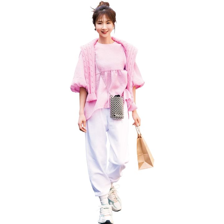 ご近所カジュアルは多幸感ピンクのトップス×スウェットパンツで大人可愛く着崩して。チークトップス 血色出しピンク ¥12,100(メイクアップトップス)肩にかけたニット ¥8,990 パンツ ¥6,990(ともにGap)ピアス ¥41,800(ウノアエレシルバーコレクション/ウノアエレ ジャパン)靴 ¥13,200(リーボック)バッグ ¥6,490(カシュカシュ/アンビリオン)ソックス/スタイリスト私物