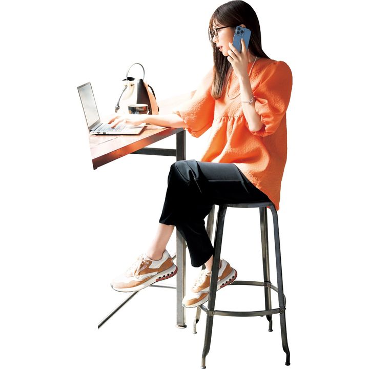 画面越しも親しみやすく。チークトップス 元気映えオレンジ ¥12,100(メイクアップトップス)パンツ[共布ベルト付き]¥29,700(ツル バイ マリコ オイカワ)眼鏡 ¥42,900(アイヴァン 東京ギャラリー)ネックレス ¥41,580(アルポ/ZUTTOHOLIC)ピアス ¥14,300 ブレスレット ¥28,600(ともにウノアエレシルバーコレクション/ウノアエレ ジャパン)靴 ¥17,600(リーボック)バッグ ¥15,400(Stola.)