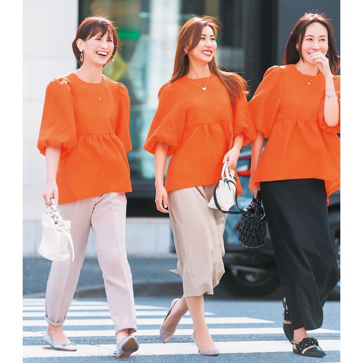 ビタミンカラーのオレンジは、とにかく写真映えNo.1!フレッシュで明るい表情に見せてくれます。「着ているだけで気分がアガります!ナチュラルメークにも映える嬉しいカラー。これからの季節にもピッタリで、太陽の下で着たい!」(吉田さん)「相性のいいベージュを合わせて優しい雰囲気に」(スミスさん)「ブラックのスカートでキリッとコーデに。今までオレンジが苦手でしたが、このオレンジは一瞬でメリハリが生まれてびっくり」(笹倉さん)