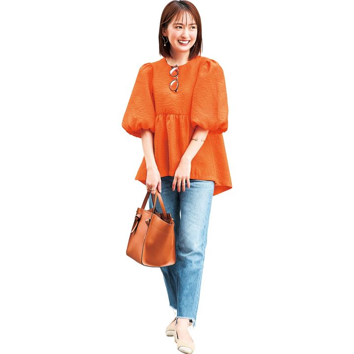 「一番お気に入りのオレンジはデニムで明るく元気な印象に。ぽわん袖も可愛くて二の腕カバーにもなるのが嬉しい。子供のお遊戯会や運動会に着て行きたいです!」(花岡さん)
