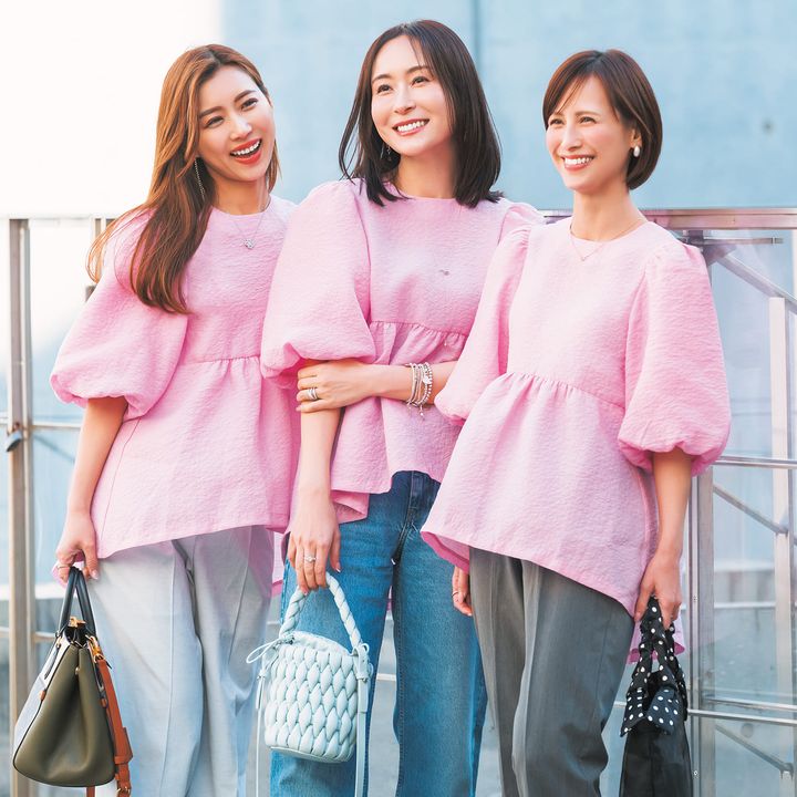 美ST世代にこそ着てほしいトーンのピンク!イエベ・ブルべ問わずどんな肌にも合うよう計算された絶妙なピンクで血色感を与えて、幸せ感溢れる印象に。「チークなしでもいいかな?って思えるほど。アフタヌーンティーやお誕生日会などのイベントにも着ていきたい♪」(スミスさん)「デニムとの相性は抜群!いつものデニムが洗練されたスタイルに」(笹倉さん)「グレーのパンツに合わせて甘辛バランスにしてみました」(吉田さん)