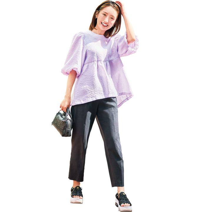 「黒のパンツと小物で引き締めて、カジュアルだけど大人っぽくまとめました。ラベンダーで顔色が華やかになるのでカチューシャで前髪を上げたら笑顔も明るく際立つ感じ!」
