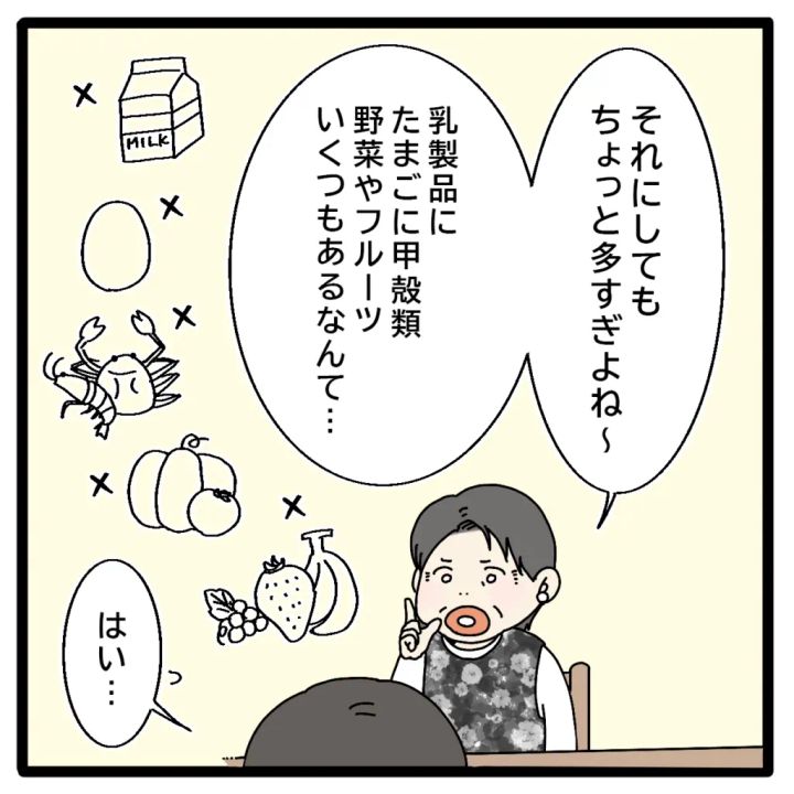 あらためてみんなと一緒のものを食べられないケイタについて「それにしても、ちょっと多すぎよね~。乳製品にたまごに甲殻類、野菜やフルーツいくつもあるなんて・・」とダメ出しする義母に、「はい・・」静かに頷くしかありませんでした。