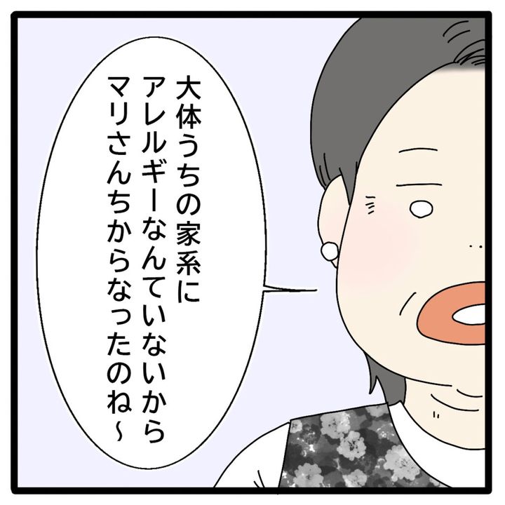我が子のことを「かわいそう」と言われてしまうと本当にショックですよね。アレルギーの原因を自分の家系のせいだと言われてしまいながらも言い返せないマリさんの辛い気持ちが伝わりました。