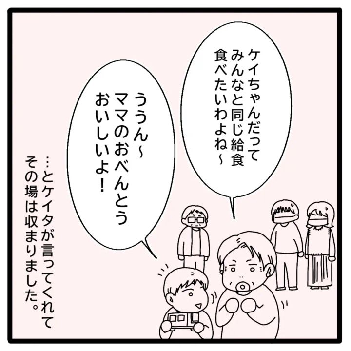 「ケイちゃんだってみんなと同じ給食食べたいわよね~」義母の声に、「ううん~。ママのおべんとうおいしいよ!」息子が言ってくれ、その場はおさまったのでした。