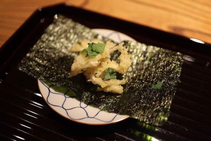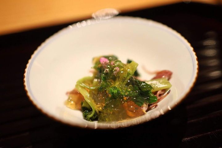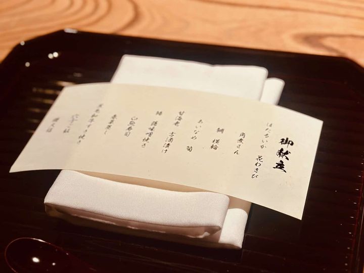 今の季節は、ほたるいかや白魚など春らしい食材を使った献立がラインナップ。新鮮な食材、美しい彩りの旬の野菜、優しい味わいの上質な出汁など、心に染みる料理がいただけます。看板料理は季節の魚を使った棒鮨で、大きな海苔を巻いていただく逸品です。