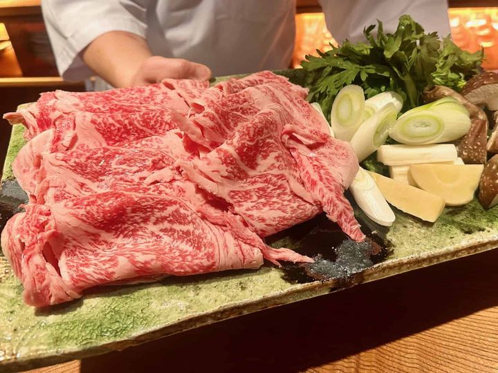 京都らしい春をイメージした美しい料理の数々をいただいた後、黒毛和牛すき焼きが登場。