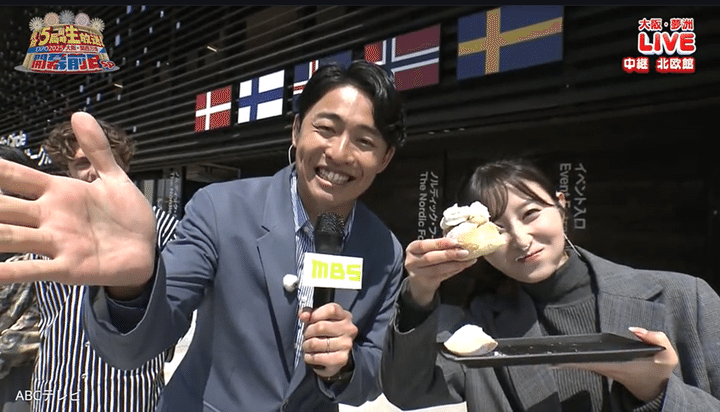 北欧館で、スウェーデンの伝統的な菓子パン「セムラ」を食リポしたのは、読売テレビの佐藤佳奈アナだ。本場流の食べ方ということで、佐藤アナは生クリームが鼻につくのを気にせず、豪快にセムラをガブリッ! 「パン、ふわっふわ!」「(中には)スパイスが入っているので、かなり風味も強いです」「(上にのっているのは)無糖の生クリームということなんで、ペロッと食べられます。おいし~!」と、佐藤アナは笑顔でカメラにアピールした。