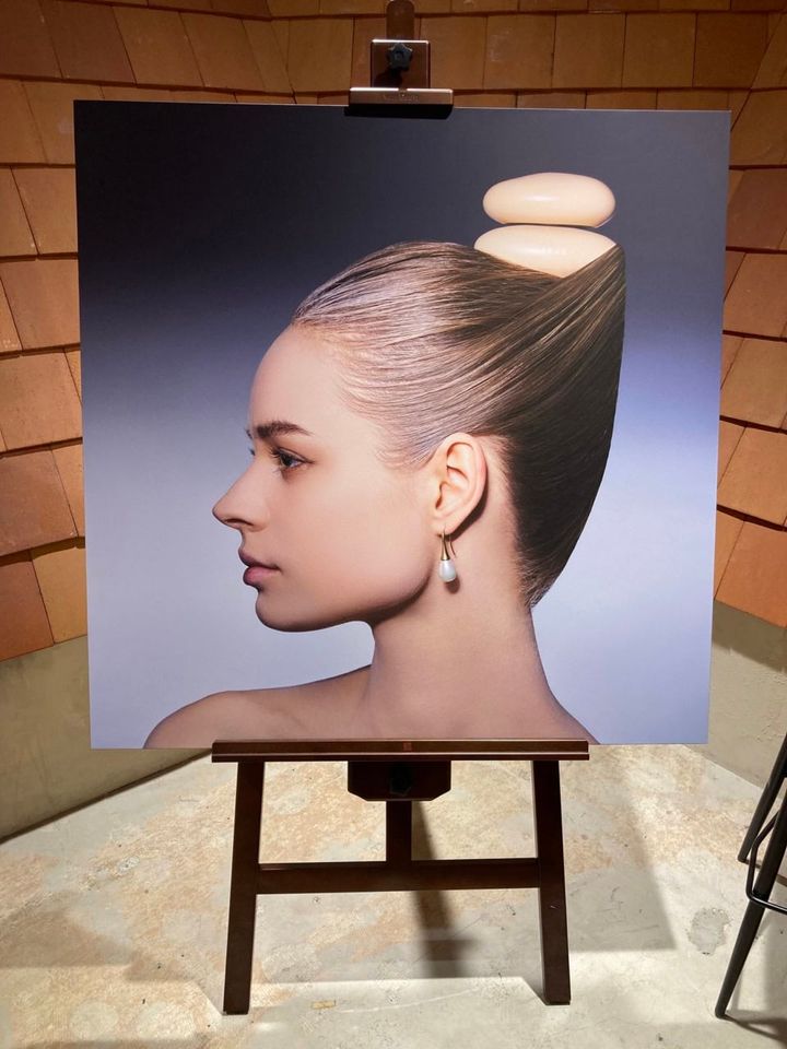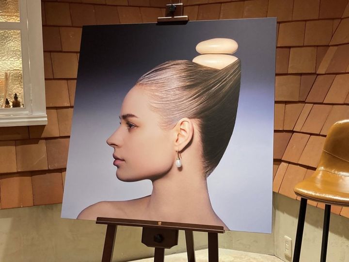 撮影当日のラストカット“ORANGE”が今回のメイン作品。冨澤さんは、「彫刻的、絵画的なエッセンスを入れたかったんです。夜会巻きのアップスタイルで、ピタッとくる位置に香水を置きました。頭に香水のせる人もいていいかなと……」とコメント。冨澤さんは、「様々な位置に香水を置いてみたが、ここに来た時に音が聞こえるような感覚がありました。いま出せる最高のものが完成しました」と振り返りました。