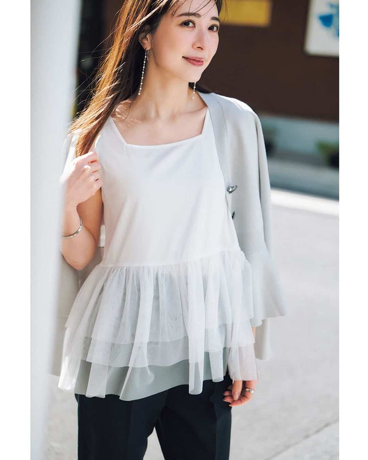 薄手のニットの上にチュールをあしらいカジュアルにもきれいめにも着られるデザイン。マシンウォッシャブルでのケアが可能なのも嬉しい。