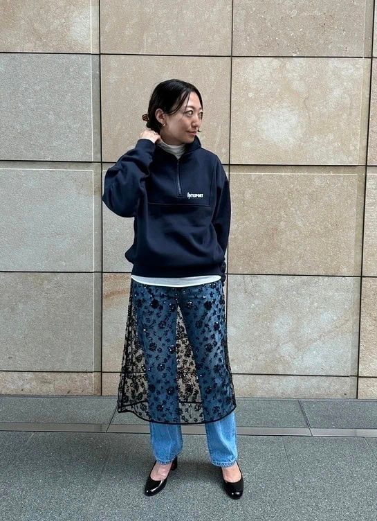 スパンコール付きのチュールスカートを重ねるだけで、ハーフジップスエットとストレートデニムのラフなスタイリングが一気に今っぽくなる! スエットの中に重ねた白いインナーの見せ方、パンプス使いもバランスUPの大きなポイント。