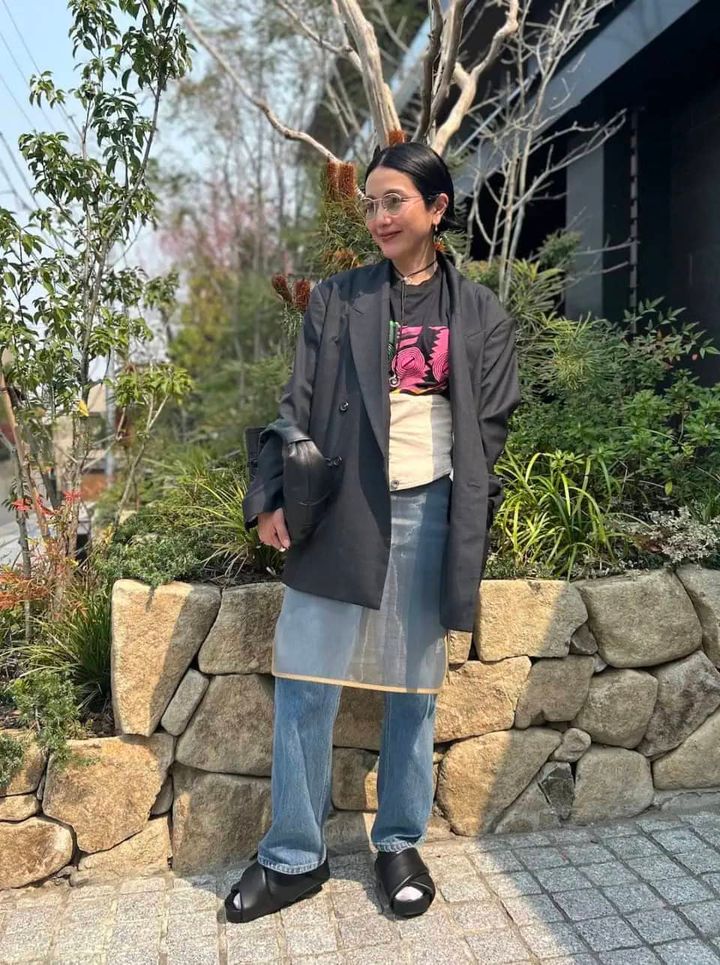 ジャケット¥79,200(JUN MIKAMI)、スカート¥33,000(FUMIKA_UCHIDA/共にikasa.)、ヴィンテージのTシャツ、pelleqのコルセット、Cristaseyaのパンツ、JIL SANDERのシューズ、LEMAIREのバッグ、YUICHI TOYAMA.のサングラス、LE MOONのチョーカー、R.ALAGANのピアスその他は全て本人私物