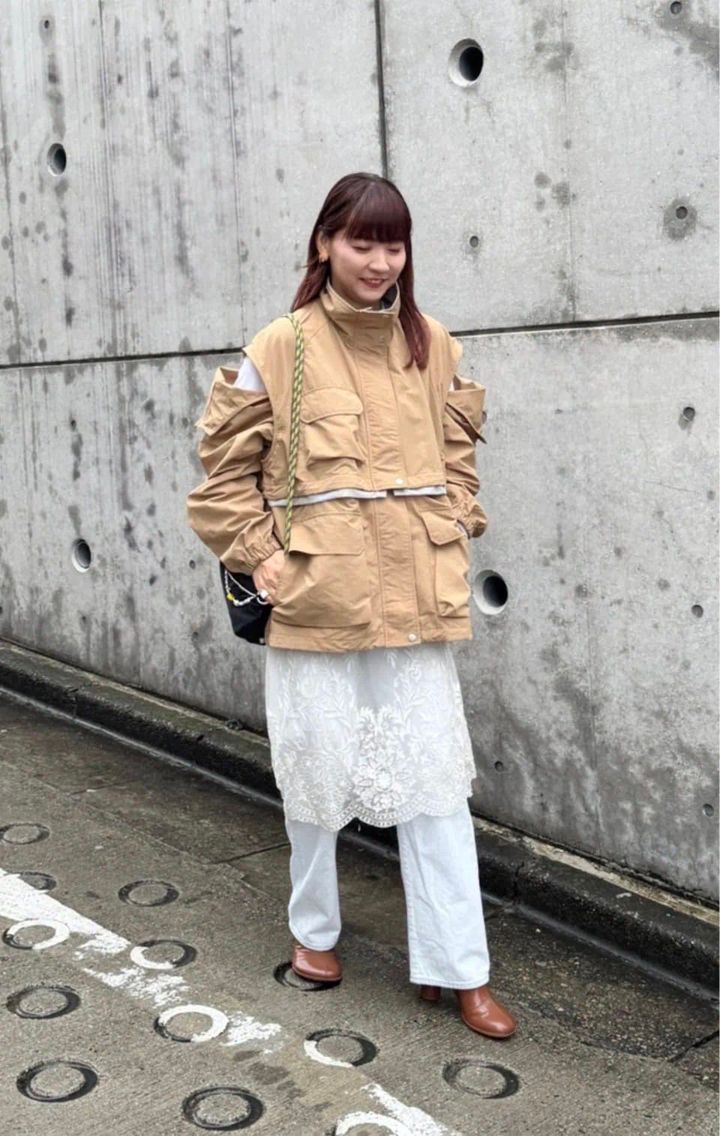 甘くなりがちなレースのスカートは、スポーティなブルゾンやデニムなど、あえて相反するテイストとMIXするのがポイント。スカートがなくてももちろん素敵だけれど、あるとないとでは違いは歴然。こんなふうに気負わずアクセサリー感覚でプラスしてみて。