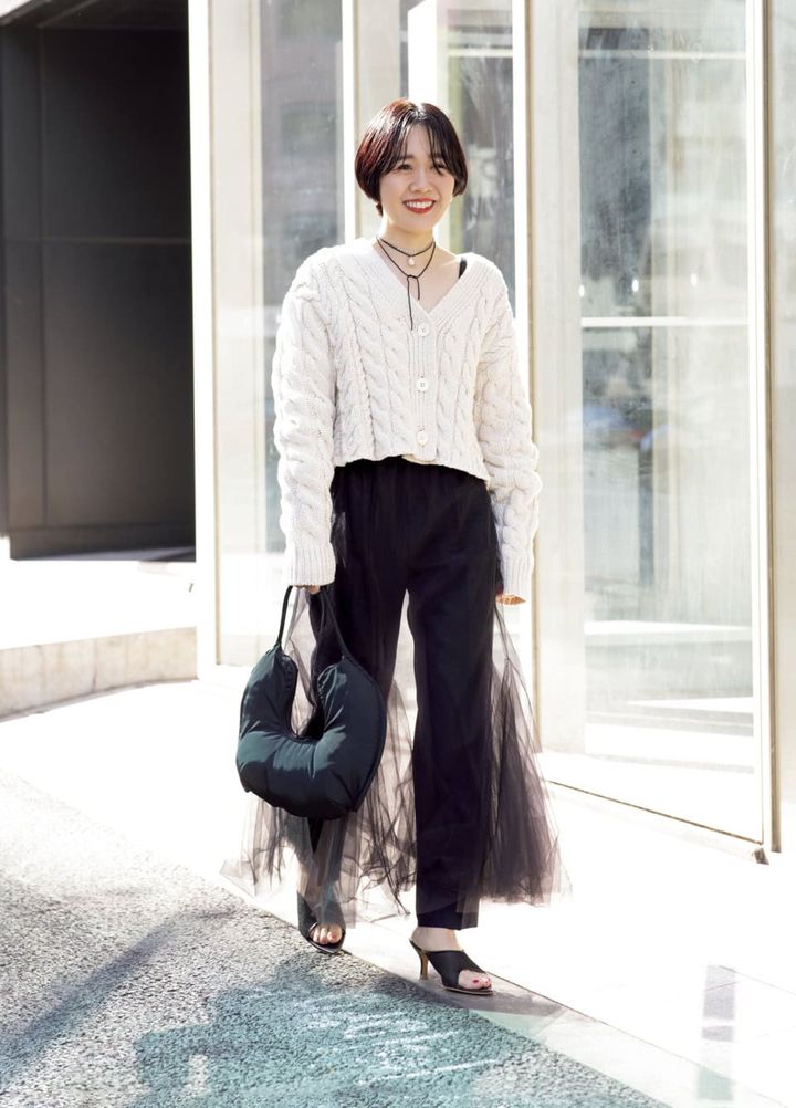 モノトーンでまとめながらも柔かなムードが漂うのは、クラフト感のあるニットと軽やかに揺れるチュールスカートのおかげ。たくさん重ねているわけではないのに、スカートの透け感で奥行きのある着こなしを実現。