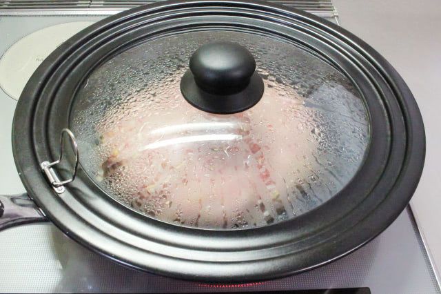 中までしっかりと火が通るように、フタをして弱めの中火で7分ほど蒸し焼きにしました。