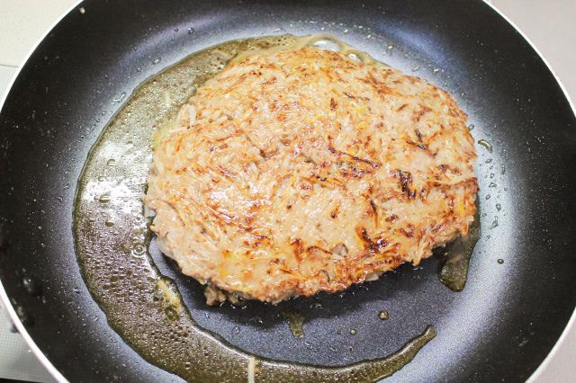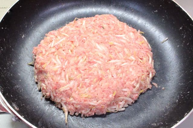 3. 【もやしと挽き肉だけの節約おかず】フライパンに全部ぶち込んで手で潰して混ぜて固めて…焼いてみた!