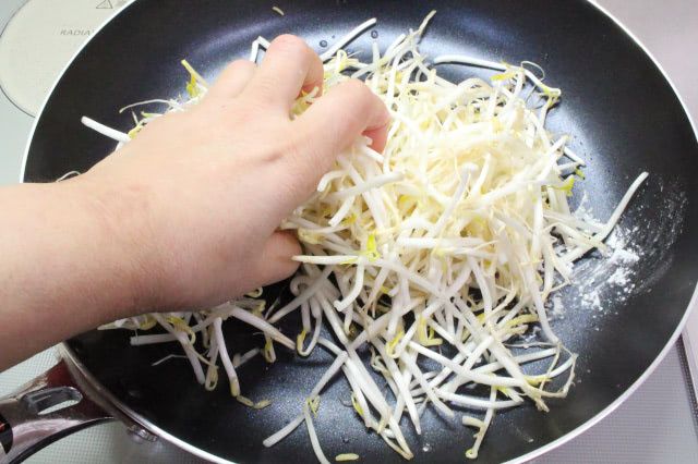 2. 点火前のフライパンにもやしと片栗粉を入れます。手で握って、もやしを細かく砕きます。