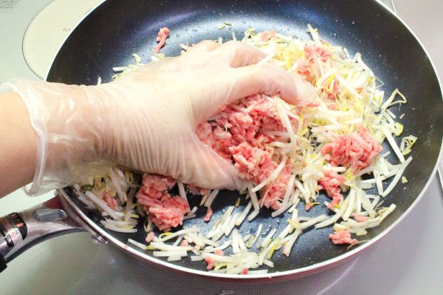 断面がこちら。もやしとひき肉を同量混ぜ合わせたので、もやしがたっぷりですね。