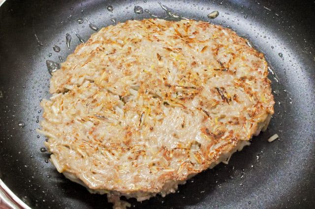 フタを開けると、余分な油が出ていたので、キッチンペーパーで吸い取ることに。ちなみにひっくり返す時は、フライパンにお皿を被せ、フライパンごとひっくり返し、お皿に乗った肉もやしを、再度フライパンに戻すという方法を取りました。こんがりと焼けていて、いい感じ♪、ですが、ひっくり返す際に一部亀裂が入ってしまいました。