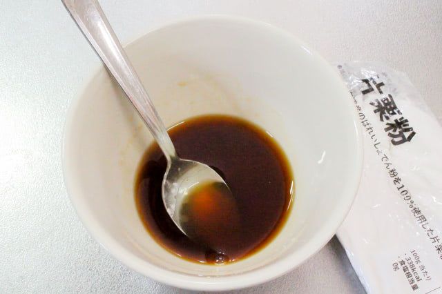 たれにとろみを付けたい場合は、片栗粉を加えるとのこと。今回は小さじ1/4程度を加えて、混ぜ合わせました。