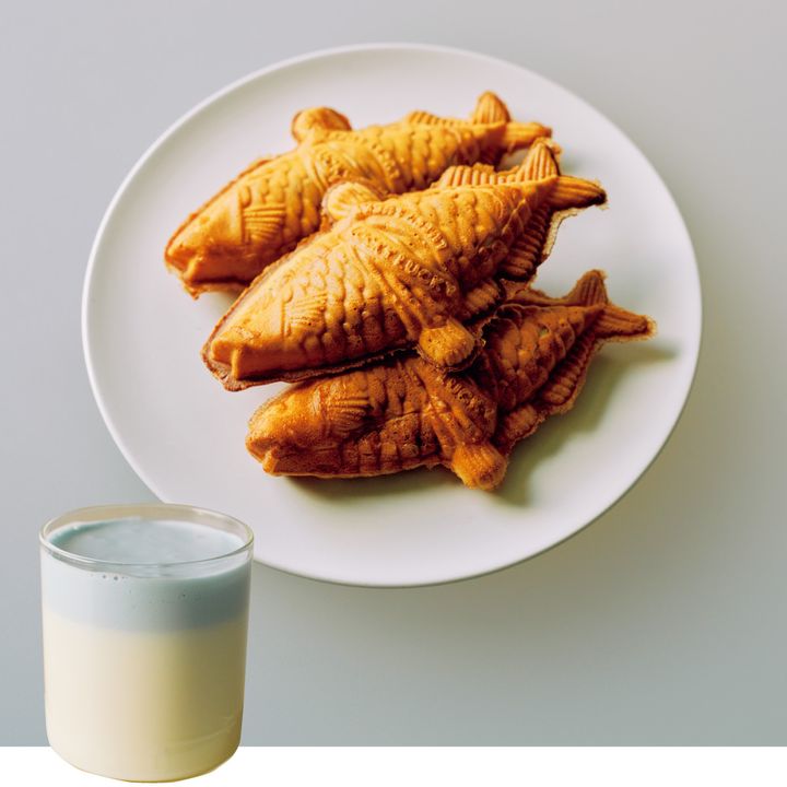 ビルの一室で営業中のカフェ。韓国のお守り“ミョンテ”を象(かたど)った鯛焼き(3,000W)とラムネ味のドリンク(6,500W)が有名。