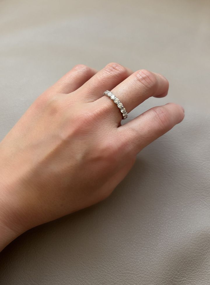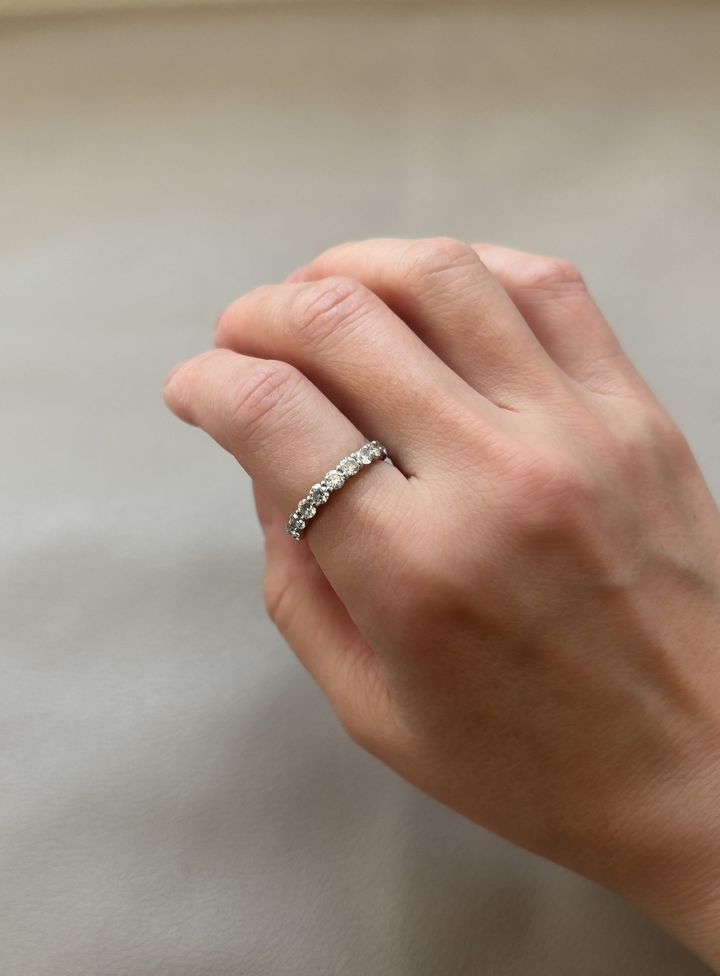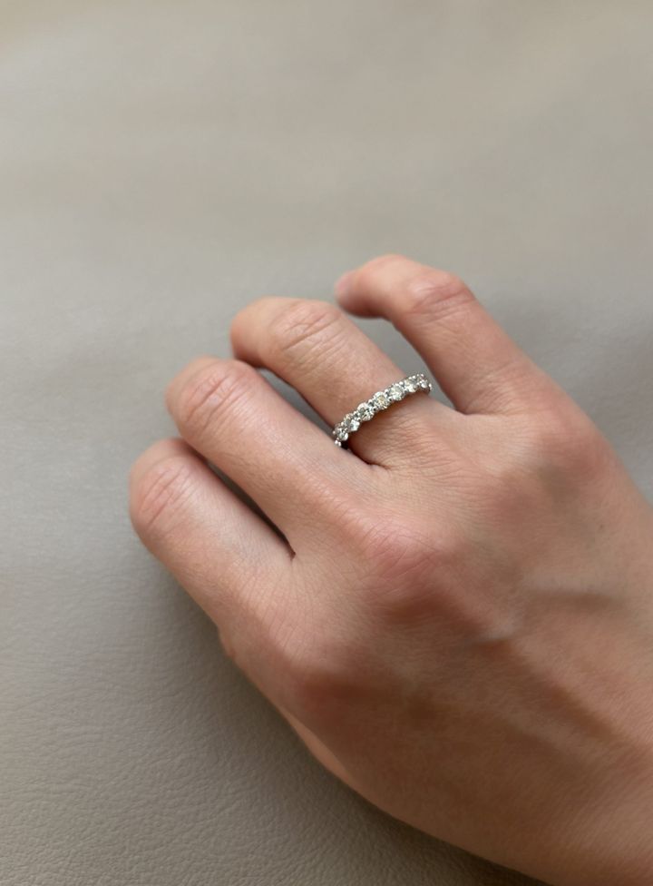 ほぼ同サイズのダイヤモンドが連なるリングのこと。大きく分けてダイヤモンドがぐるりと一周セッティングされた「フルエタニティ」とダイヤモンドが半分セッティングされた「ハーフエタニティ」があります。
