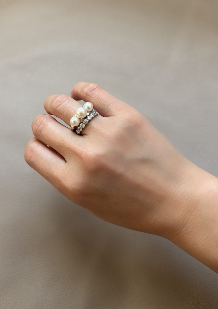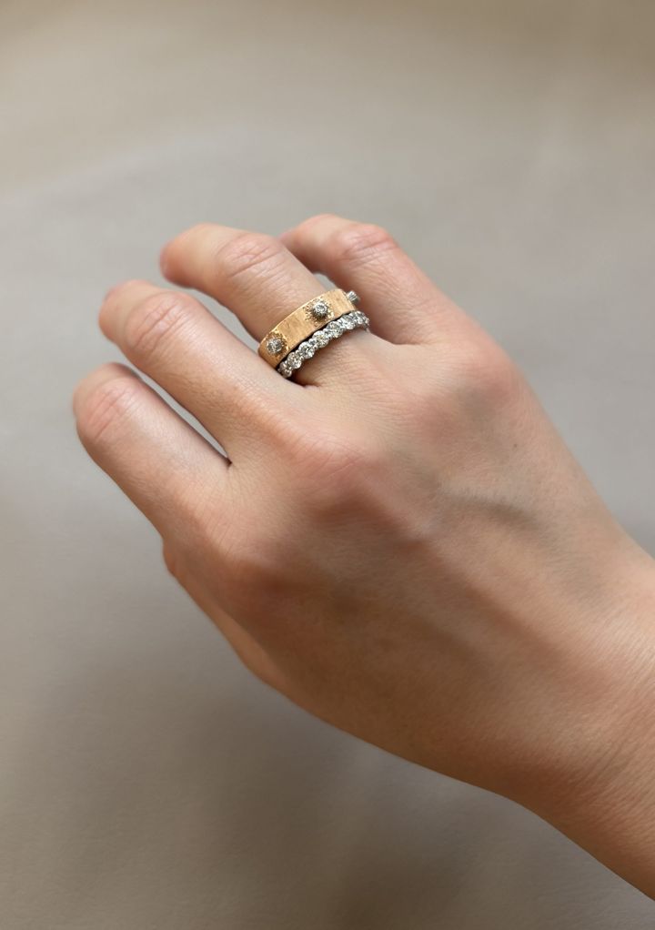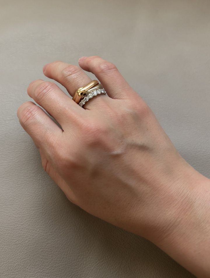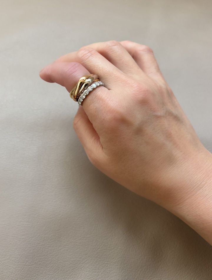 ダイヤモンドのない地金リングと重ねると、ダイヤモンドの煌めきをプラスされ華やかな印象に。基本的にコーディネート全体の地金の色を揃えたいタイプなのですが、この組み合わせだけはかなり好きで、自分のセオリーを封印して使うことも多いです。