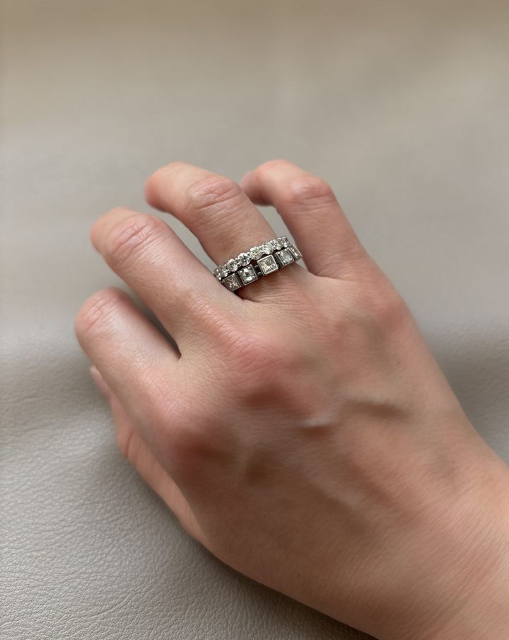 シンプルなエタニティリング同士は、合わない理由がありません。(私はホワイトゴールド台のエタニティリングをそんなに持っていないので、少し個性的なエタニティリングとの組み合わせになってしまっていますが)