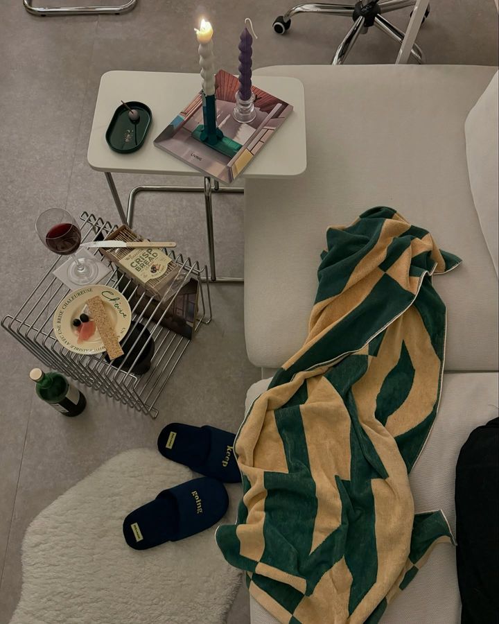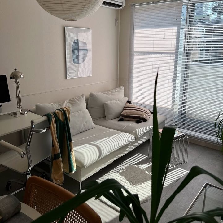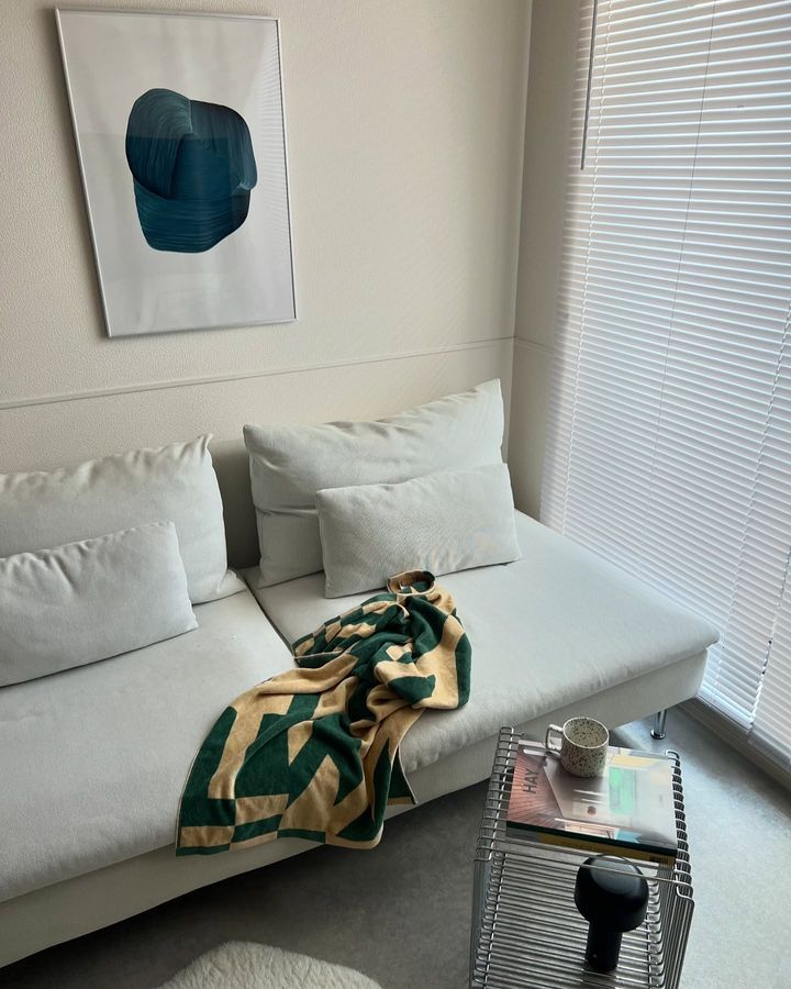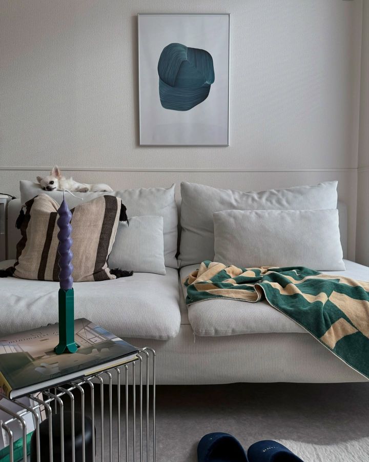 IKEAの白いソファの周りは殺風景にならないように、ロナン・ブルレックのアートポスターを飾り、MYTONEのバスタオルをブランケットがわりに。HAYのキャンドルホルダーはご自身でつくられているパープルのキャンドルをあわせて。グリーンやパープルなどの小物ををうまく取り入れた絶妙なカラーバランスが素敵です。