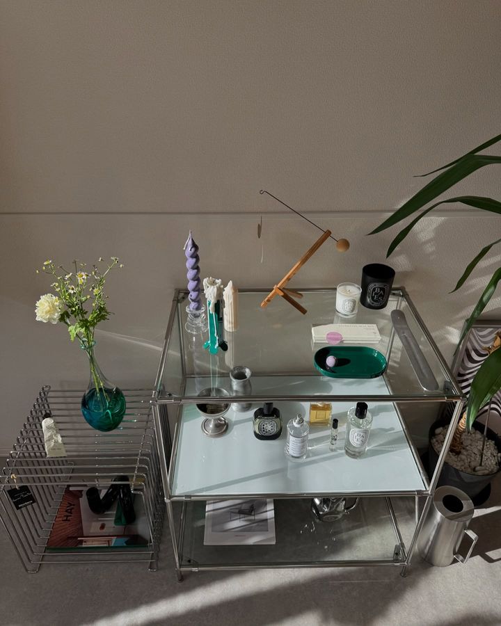 モンタナのパントンワイヤーと、韓国のfurnihunterのモジュール家具を並べたコーナーは、香りのアイテムやフラワーベース、キャンドルなど、特にお気に入りのものを置くためのスペース。ワイヤーやガラス天板のアイテムを選ぶことで、小さなお部屋でも圧迫感を与えにくい効果もあります。