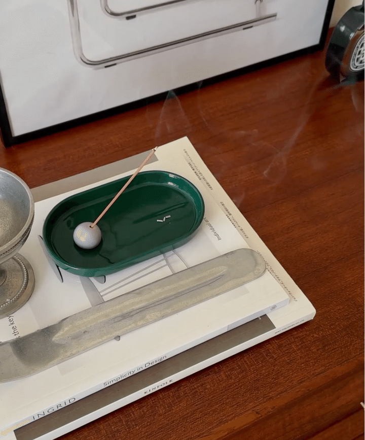STUDIO THE BLUE BOY のインセンスホルダーも、グリーン×パープルの配色が気に入って購入。「波佐見焼の陶器でできていて、日本の要素が入っているところがいいなと思い購入しました。すごく丁寧につくられていて、最近のお気に入りです」
