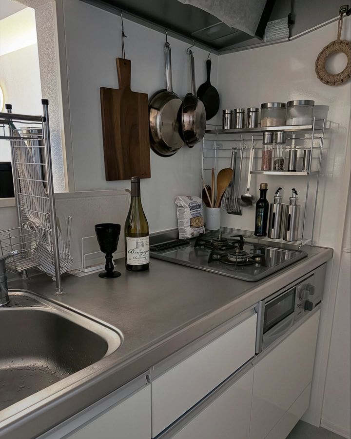 キッチンの収納棚や調味料ボトルなどの小物もステンレスのもので揃え、統一感を大切にされています。