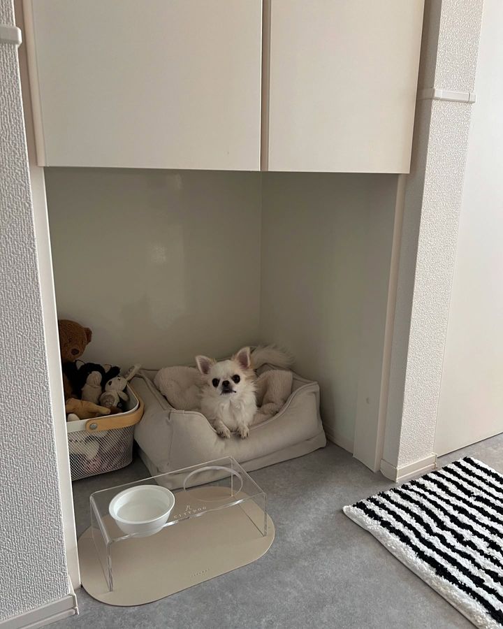 お部屋の決め手のひとつはペット共生型マンションであったこと。収納の下にペットスペースがあったり、ナノイー消臭がついていたり、ワンちゃんとの暮らしを快適にしてくれる仕組みがいろいろと備わっているのだそう。